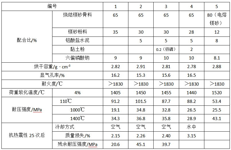 表1-1 鎂質(zhì)耐火澆注料的配合比和性能