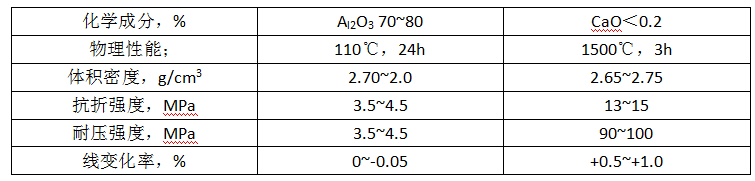 用氧化物超微粉或氧化物溶膠結(jié)合的無水泥澆注料的理化性能與低水泥和超低水泥澆注料相似,但因這類澆注料的雜質(zhì)含量低,材料內(nèi)低共熔物相更少,其耐火度、抗侵蝕性和高溫結(jié)構(gòu)強(qiáng)度均優(yōu)于低、超低水泥澆注料。由于氧化物超微粉表面積大,表面能大,活性高,因此這類材料易于燒結(jié),其強(qiáng)度是隨熱處理后的強(qiáng)度要比烘干后高。典型SiO2微粉結(jié)合的無水泥微粉結(jié)合的無水泥高鋁質(zhì)澆注料的理化性能如下:
