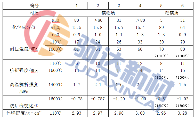 高純鎂鋁(鋁鎂)質(zhì)耐火澆注料的性能,見(jiàn)表1-1。耐火骨料臨界粒徑為8mm或5mm。編號(hào)1~編號(hào)4用的耐火骨料為MgO97%的電熔鎂砂,用量為65%,耐火粉料也為電熔鎂砂粉,用量為21.5%;編號(hào)1用的電熔剛玉粉小于0.088mm的為10.5%、超微粉為3%;編號(hào)2~編號(hào)4用的電熔剛玉粉小于0.088mm的8.5%,編號(hào)2用其超微粉5%。編號(hào)3和編號(hào)4則用α-Al2O3超微粉5%。剛玉和α-Al2O3超微粉的比表面積分別為26m2/g和36m2/g;編號(hào)5用的骨料為致密白剛玉,白剛玉和α-Al2O3作耐火粉料,同時(shí)添加5%的高純燒結(jié)鎂砂(MgO97.6%)粉;編號(hào)6用的耐火骨料為Al2O390%的特級(jí)礬土熟料34%、高純電熔鎂砂粉30%和鋁鎂尖晶石4%。耐火粉料為剛玉粉和MA粉、α-Al2O3和SiO2超微粉。結(jié)合劑為CA-80水泥,并摻加適量外加劑;編號(hào)1~編號(hào)5用的結(jié)合劑為CA-70水泥,其用量約為4%。按材料配合比要求,加減水劑0.15%,水用量為5%~6.5%,成型制樣,自然養(yǎng)護(hù)。養(yǎng)護(hù)3d后檢驗(yàn)常溫耐壓強(qiáng)度,一般為6~16MPa。