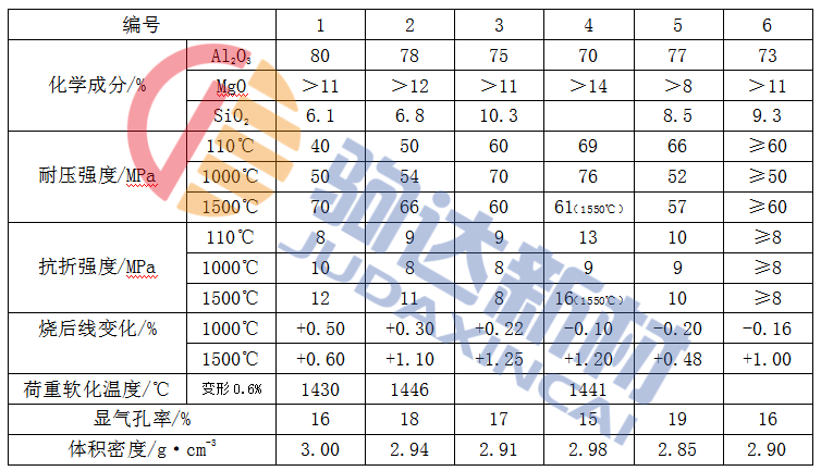 超微粉結(jié)合鋁鎂尖晶石質(zhì)耐火澆注料用的耐火骨料,主要是山西特級(jí)礬土熟料,Al2O3與TiO2含量約為90%,臨界粒徑約為25mm,一般采用連續(xù)顆粒級(jí)配,也有用間斷級(jí)配的;結(jié)合劑為活性的SiO2超微粉,SiO2大于91%,中直徑D50約為3um,另加聚磷酸鈉等分散劑和快干劑。其性能見表1-1。基質(zhì)中均加高檔次的鋁鎂尖晶石粉、剛玉粉和α-Al2O3超微粉。表中編號(hào)1添加電熔鎂砂粉、剛玉粉和α-Al2O3超微粉。表中編號(hào)1添加電熔鎂砂粉,用量約為9%;編號(hào)2添加高純鎂砂粉,編號(hào)4添加MgO約為94%的燒結(jié)鎂砂粉,編號(hào)3、編號(hào)5和編號(hào)6則為中檔鎂砂粉。其細(xì)度均不大于0.088mm。
