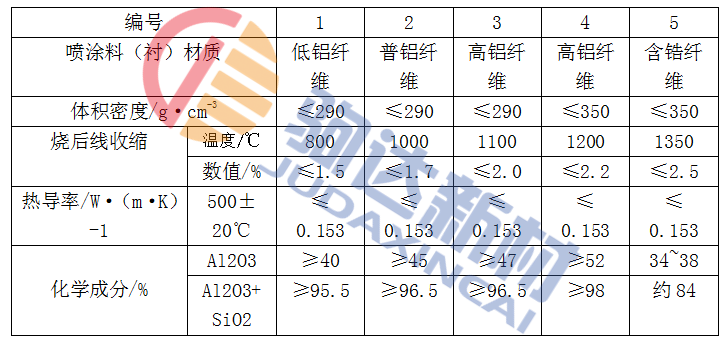 耐火纖維噴涂料(襯)是用專門噴涂機將預處理好的纖維高壓送至噴槍、同時用膠泵將結合劑送至噴槍外環縫隙內,纖維和結合劑邊噴出槍口邊混成一體噴射到受噴面上,便形成噴涂層。然后,用便攜式針刺機進行二次絞織處理,使其成為三維網絡結構,以提高襯體縱向抗拉強度,延長使用壽命。表1-1為耐火纖維噴涂料(襯)的性能。
