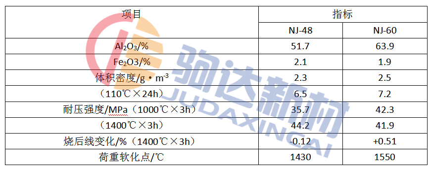 NJ-48主成分是特級煅焦、二級礬土;NJ-60主成分是三級碩土一級礬土。兩個牌號的澆注料都是以優質藍晶石為體積穩定性,以軟質粘土A為結合劑,以鋁酸鹽水泥為促凝劑,并加入少量添加劑。其粒度組成為10mm~3mm,35%,3mm~1mm 15%,<1mm 20%,<0.1mm 30%。理化性能見表1。