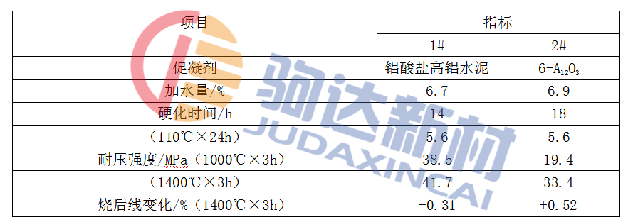 為了進一步提高粘土結合澆注料的使用溫度,作者設想用σ-Al2O3替代鋁酸鹽水泥做促凝劑,并在實驗室條件下(氣溫20℃)做了對比試驗,試驗結果如表3所示。