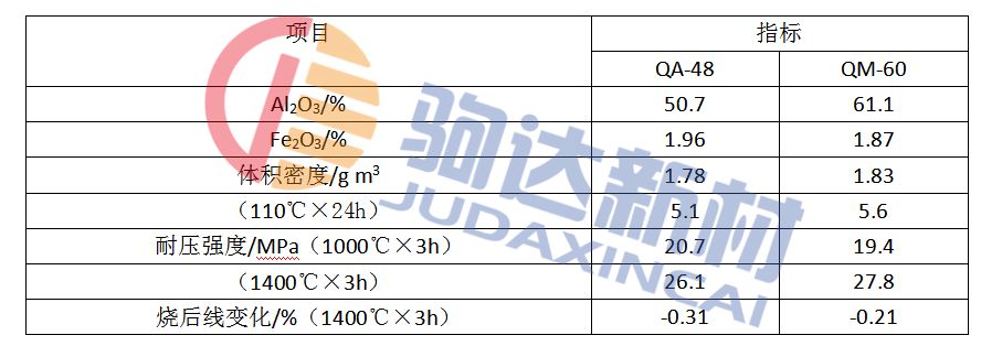 QA-48料,顆粒料采用優質輕質高鋁骨料,粉料為二級礬土細粉;QM-60料,顆粒料采用輕質莫來石骨料,一級礬土細粉為粉料。結合劑都是軟質粘土A,促凝劑為鋁酸鹽水泥,并加入部分外加劑。表2是兩種粘土結合輕質澆注料的理化性能。