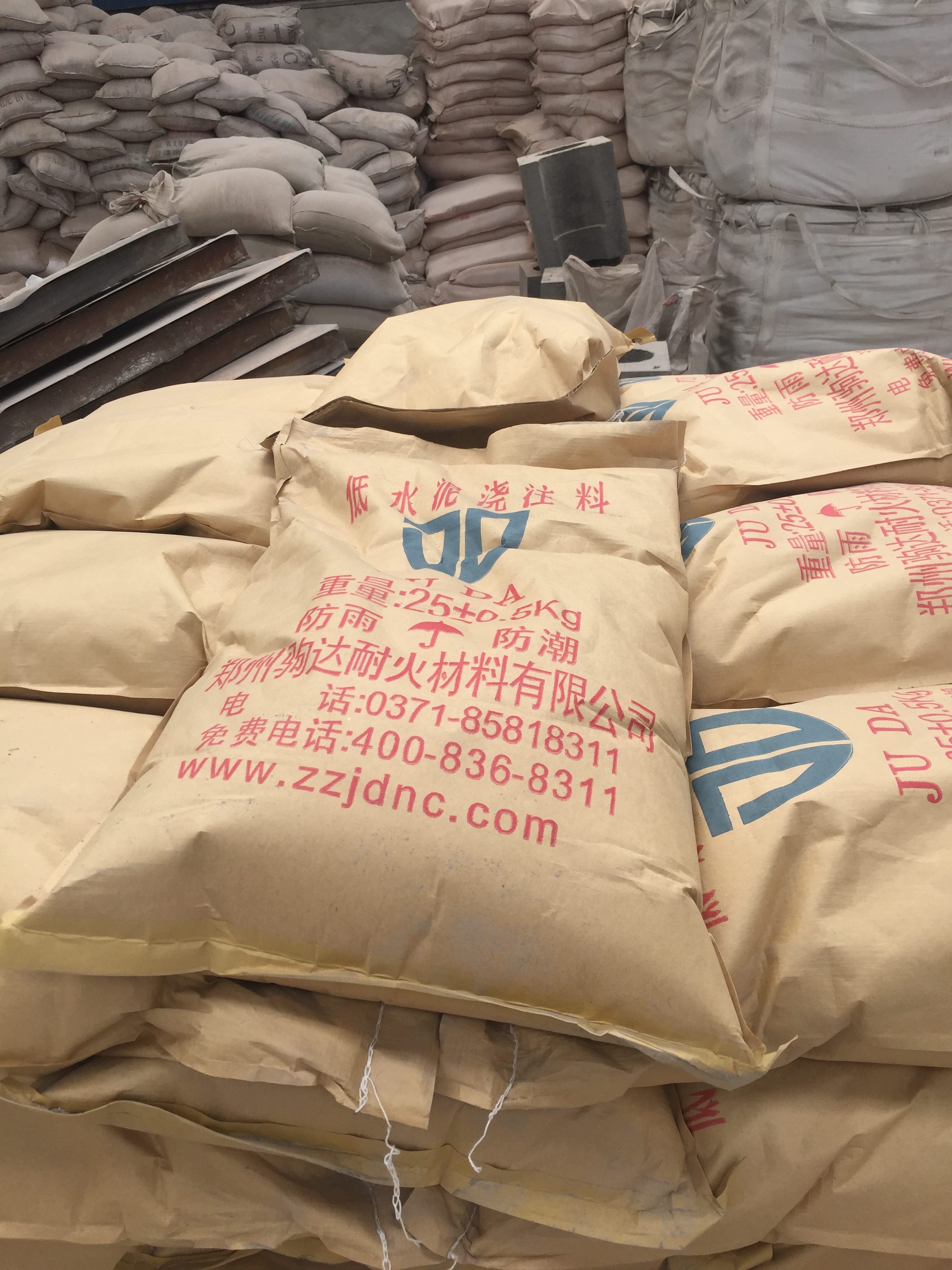 鉛鋅流槽用低水泥高鋁質澆注料的原料配比(w):特級高鋁熟料8~5mm10%~20%,5~3mm 15%~30%,3~1mm 10%~20%,<1mm 15%~30%,<0.088mm特級粉10%~20%,硅微粉3%~7%,氧化鋁微粉1%~5%,純鋁酸鈣水泥4%~8%,其余外加劑0.1%~0.3%。
