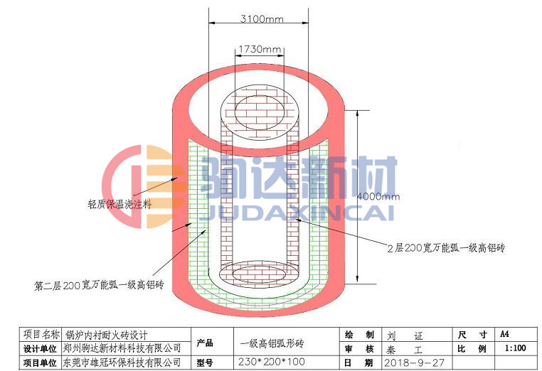 我公司是專業從事耐火材料的生產制造與窯爐的設計安裝工作,主要生產耐火磚有高鋁材質、粘土材質、剛玉材質、碳化硅材質和輕質隔熱耐火磚等耐火材料,近期我公司收到東莞雄冠環保科技有限公司,發來的30t熱解爐使用耐火材料的分布圖并希望能夠得到我公司在材料與設計安裝上的支持,收到相關資料后我公司設計安裝部門進行了核對,并繪制相關使用的萬能弧耐火磚的設計砌筑方法。雄冠環保提供的熱解爐相關資料。