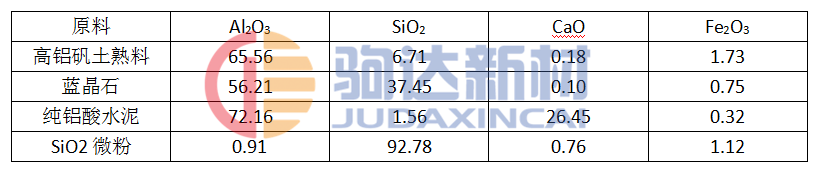 實驗選用二級高鋁礬土熟料為主要原料,藍晶石為膨脹劑,純鋁酸鈣水泥和二氧化硅微粉為結合劑。主要原料的理化指標見表1。