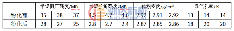 通常在低水泥耐火澆注料生產后自然養護過程中,24h之內為自然反應排氣階段,坯體微熱,表面慢慢硬化,經過3~5天的放置后,表面就會出現起皮現象,在氣泡孔隙的周圍出現白色的細粒,輕輕用手按壓發現表面3~5mm已經發軟,并逐漸粉化剝落,有的甚至達10~15mm,這勢必影響產品的結構強度,導致產品使用壽命大大降低,以至不能使用。取剛澆注凝結的樣品和粉化后的樣品進行物理指標檢測。其結果見表1。