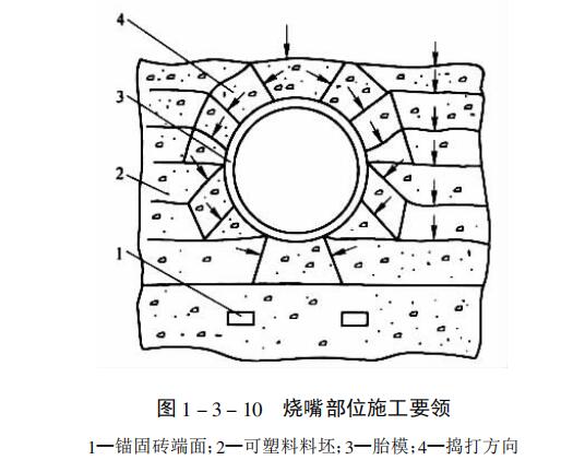 搗打耐火可塑料爐墻時(shí),首先將料坯緊密無間的平擺起來,只準(zhǔn)擺一層料坯。工作面 側(cè)應(yīng)安放完整無損的料坯,其內(nèi)側(cè)允許安放掉角、破損的料坯或修整下來的碎料;其次用搗固機(jī)或風(fēng)鎬搗打,錘頭沿爐墻長度方向行走,錘頭面應(yīng)疊壓1/4左右。整個(gè)料坯面搗打2~3遍即可錯(cuò)縫鋪置下一層料坯,然后繼續(xù)搗打,依此類推;第三,當(dāng)遇到錨固磚時(shí),將爐墻可塑料搗打至錨固磚上表面,在安裝磚的位置挖去部分料,放置壓模,打進(jìn)可塑料中,當(dāng)達(dá)到安放錨固磚的尺寸時(shí),將壓模取出,安裝錨固磚。這樣能使錨固磚與耐火可塑料緊密咬合,防止竄火,同時(shí)也防止?fàn)t墻內(nèi)傾或倒塌;第四,當(dāng)遇有孔洞時(shí),例如燒嘴部位,其施工要領(lǐng)見圖2。當(dāng)爐墻搗打面至燒嘴下表面約為100mm時(shí),牢固地安裝胎模,一層層的鋪料坯,分層進(jìn)行搗制。每層施工時(shí),先搗打胎模周圍料坯,再打水平鋪的料坯,最后封口。