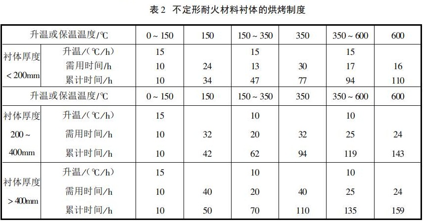 不定形耐火澆注料的烘烤制度,與其材料品種和性能,施工制作方法,襯體厚度和使用條件等因素有關。因此,制定襯體的烘烤曲線,應充分考慮各方面的情況,總的原則是在600℃之前,應緩慢升溫和保溫,以便襯體中的水分充分排除。表2為不定形耐火澆注料襯體的烘烤制度。在600℃保溫之后,也可在800℃時保溫8~16h,其升溫速度一般為20~35℃/h;在一般情況下,可參照該制度,制定出具體的襯體烘烤曲線。低水泥系列耐火澆注料等致密型澆注料的烘爐時間,應比表內給定的時間多24~48h。