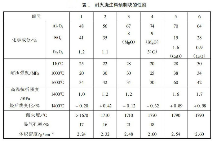 應當指出,凡是耐火澆注料和耐火可塑料等材料,均可作預制塊。由于生產條件比現場施工好,因此性能也有所提高,一般可參見前述有關性能,F舉例,見表1。編號1和編號2為 CA-50水泥和磷酸黏土質澆注料預制塊,其骨料為小于10mm的黏土熟料顆粒70%,小于0.09mm的高鋁粉分別為15%和30%,CA-50水泥分別為15%和2.5%。前者摻加減水劑,水用量為10%。后者用濃度為42.5%的磷酸作結合劑,用量13%;編號3和編號4為水玻璃鋁鎂質澆注料預制塊,其骨料和粉料為一級礬土熟料,小于5mm的骨料用量60%,粉料分別為30%和26%,制磚鎂砂粉10%,模數為2.8、密度為1.32g/cm³的水玻璃用量9%,后者加4%的鱗片石墨;編號5和編號6分別為低水泥和超低水泥高鋁質澆注料預制塊。預制塊的形狀,主要有方形、長條形、拱形和環形等,均為特異形制品。