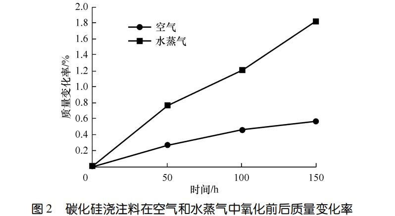 圖1示出了碳化硅澆注料在空氣和水蒸氣氧化前后的顯氣孔率。可以看出,無論是空氣還是水蒸氣氧化,顯氣孔率均變化不大。氧化150h試樣與氧化前相比,水蒸氣條件下的顯氣孔率略有增大;空氣條件下的顯氣孔率略有減小。可能與水蒸氣條件下試樣結構遭到較大破壞有關。一般情況下,碳化硅氧化會因氧化產物SiO2等堵塞氣孔導致氣孔率在氧化初期下降明顯,后期逐漸趨于平穩,但對于碳化硅澆注料卻沒有出現早期顯氣孔率下降的情況。可能