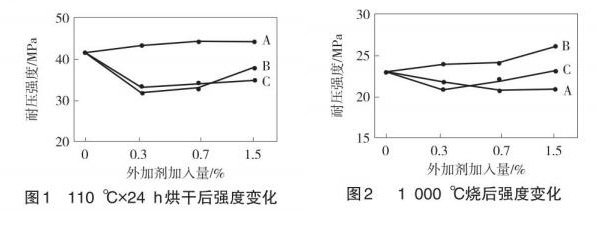 各試樣120℃×2h烘后,保存50d,其水分含量見圖3。以不加外加劑0與加3種外加劑A、B、C的料對比看,A、B、C都有一定的促進高鋁質磷酸鹽澆注料保存作用,且隨著保存劑用量的增加,保存效果更為明顯。相對看,草酸的保濕效果好。保濕性好則代表施工性能更好。